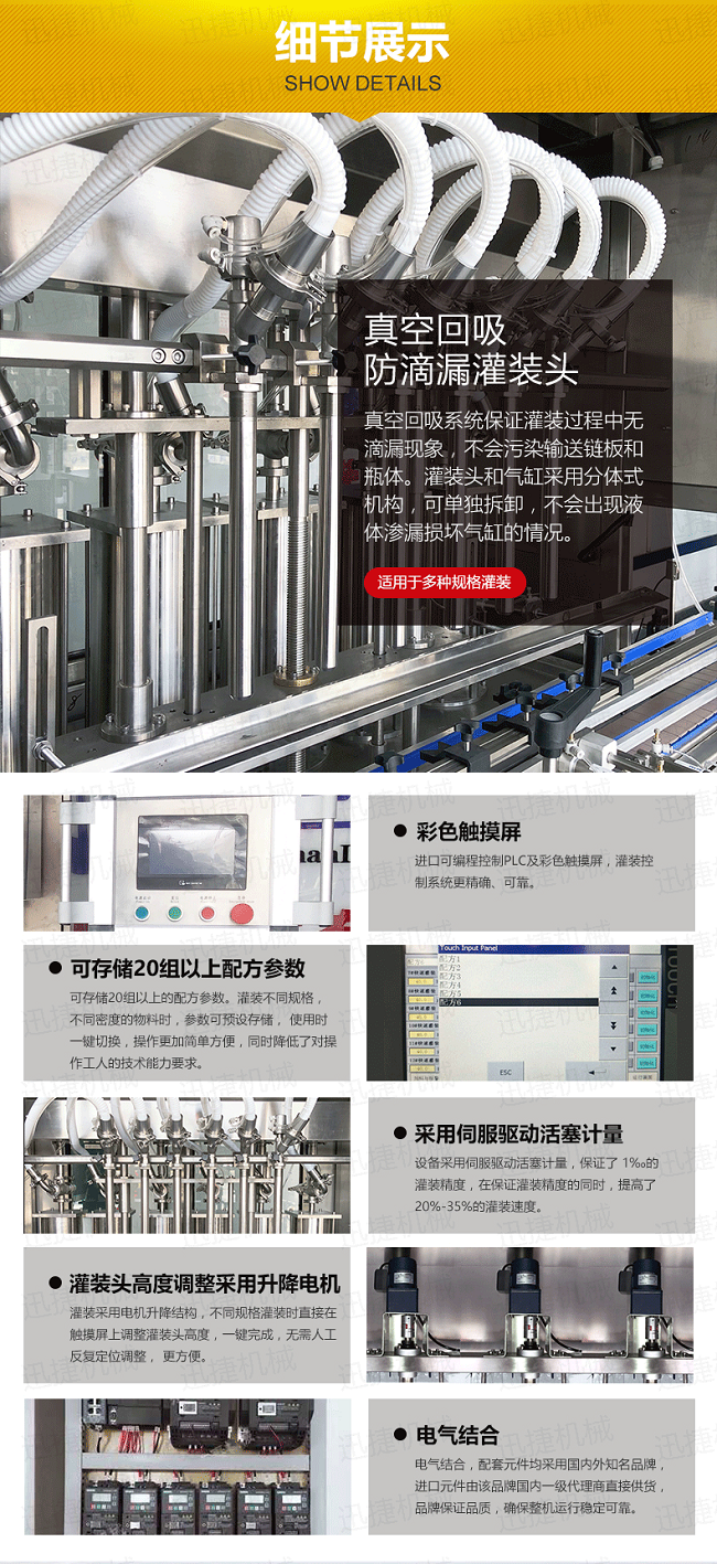 2、本機由可編程控制器(PLC)配合智能觸摸屏(人機界面)控制,人性化的設計使調整灌裝量及修改各種參數(shù)等操作均十分簡單、快捷、直觀;